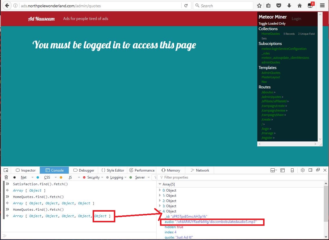I opened a Web Console and ran HomeQuotes.find().fetch() and it shows me an array of 5 objects, I clicked on the 5th object and found the URL for the MP3 file, http://ads.northpolewonderland.com/ofdAR4UYRaeNxMg/discombobulatedaudio5.mp3