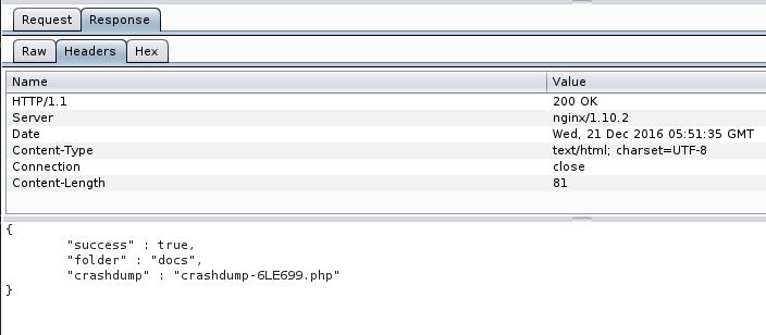 The respond to this JSON request was a JSON indicating the a crashdump PHP file was created in the docs directory.