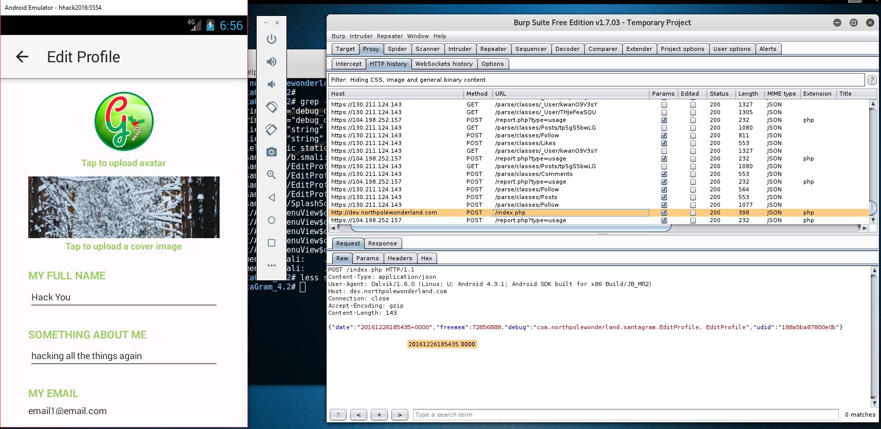 It seems the res/values/strings.xml file has the parameter we need to change and also need to interact with the EditProfile part of the app, but I changed the debug_data_enabled value to true, recompiled and signed as explained by Josh Wright here, and also here in this video, but no luck, editing the profile didn’t trigger any communication with the debug server.