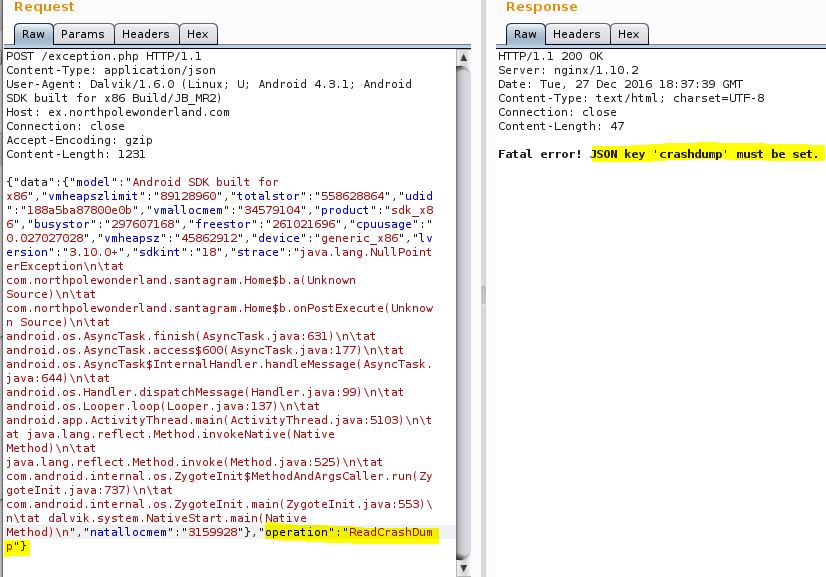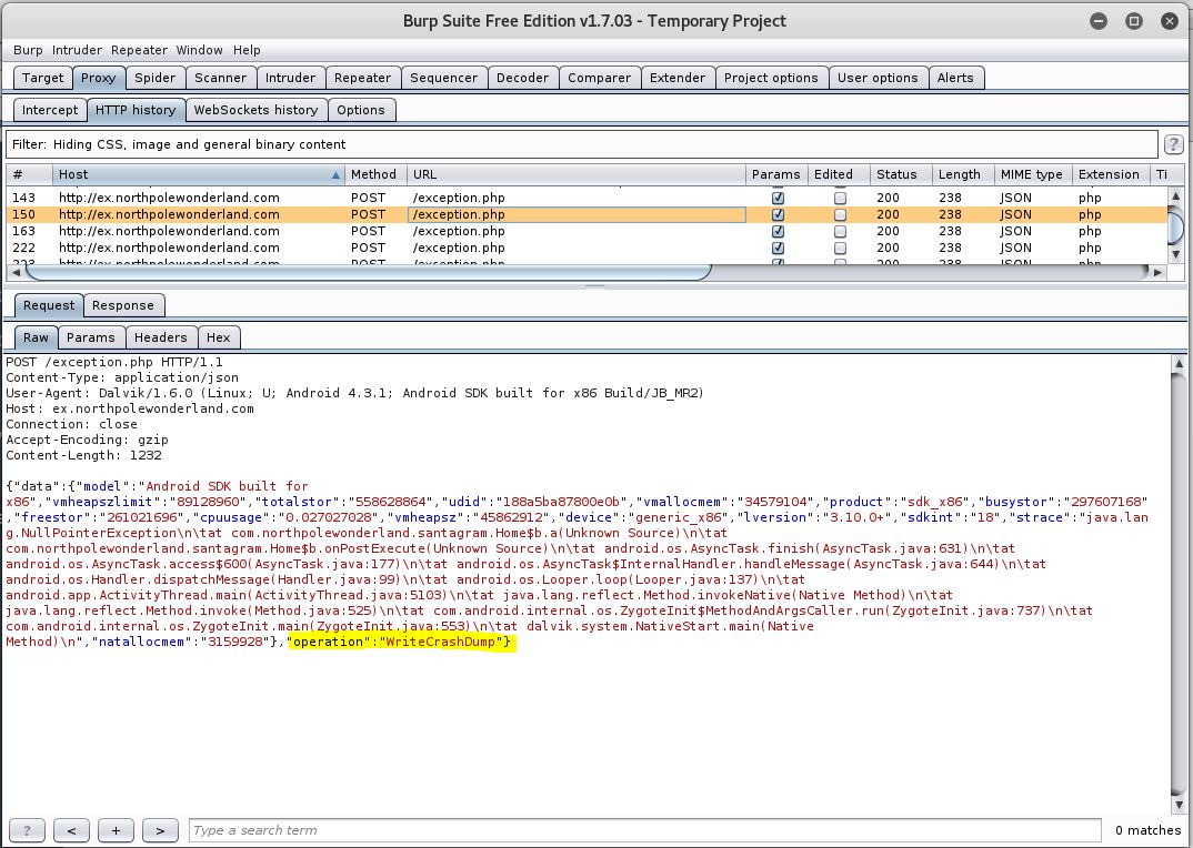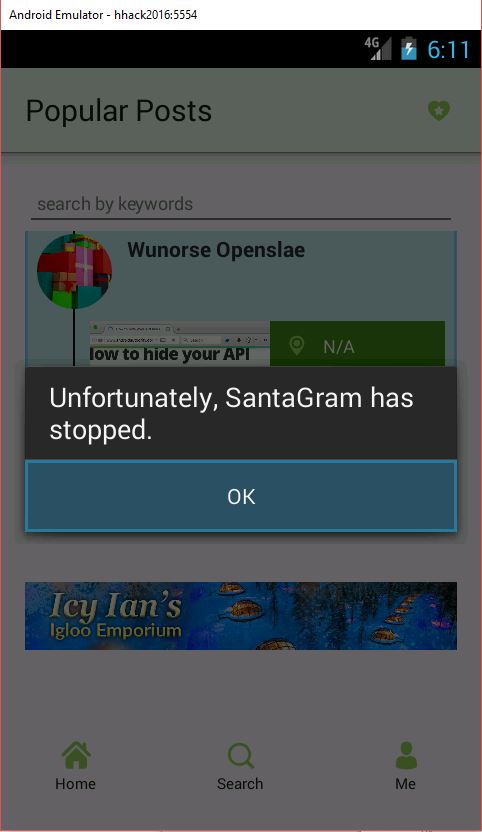 As I used the SantaGram app I noticed that it would crash every time I tried to use the Search option and scroll down the posts, and this will trigger a message to the http://ex.northpolewonderland.com/exception.php URL.