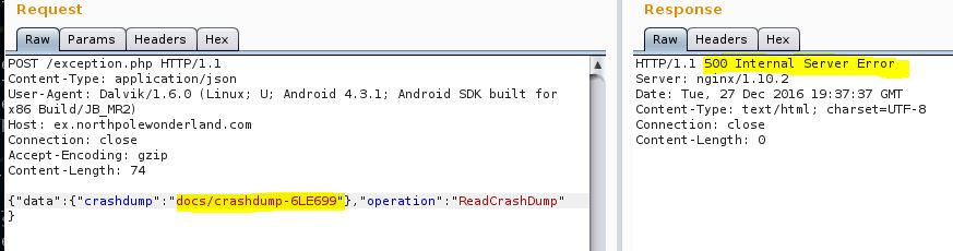 I changed the operation to ReadCrashDump to see what else can I find out and it tells me that I need a crashdump key set in the JSON for it to work, so this means this can read the crashdump-XXXXX.php files it creates and I try that without all the other values and got an HTTP 500 errors that I can interpret as it tried to execute the PHP but failed.