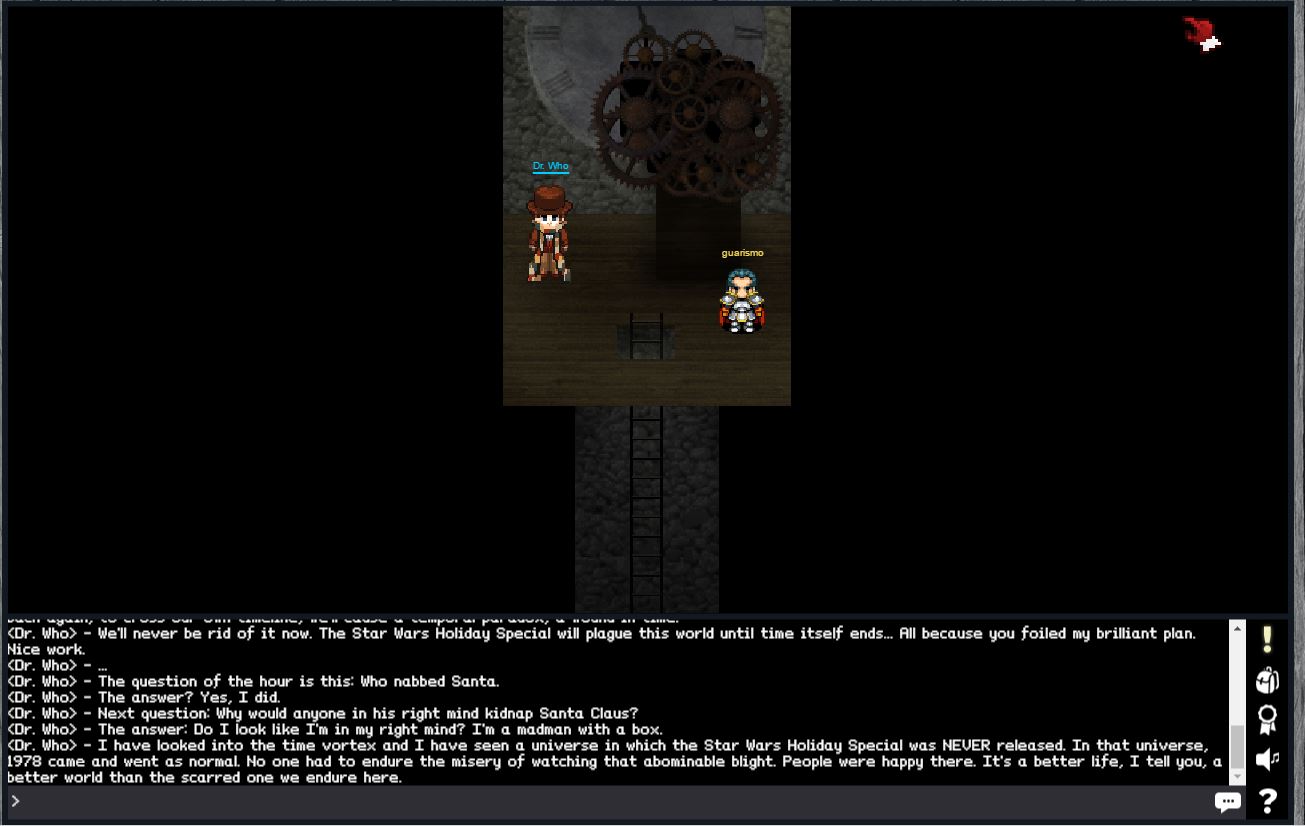 That whole sentence was the passphrase for the last door without a terminal where I found The Doctor who confessed kidnapping Santa to use he’s powers for a greater good, removing the existence of the Star Wars Holiday Special from 1978.