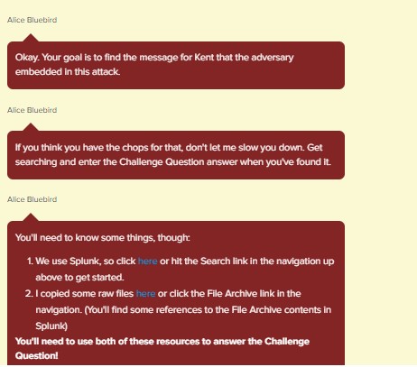 Alice Bluebird is ready to train us in Splunk by helping the SOC answer a few questions about the incident. She gives as some info about the attack, they are related to the RITA Zeek logs we analyzed before and the hostâs name is âsweetumsâ