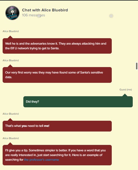 Alice gives us the next tip, Prof Banas is very close to Santa, so they were probably exchanging important information, we know from previus engagements with Santa that they most important data the North Pole manages is the Nice and Naughty list, so we see if we can find anything related to that.