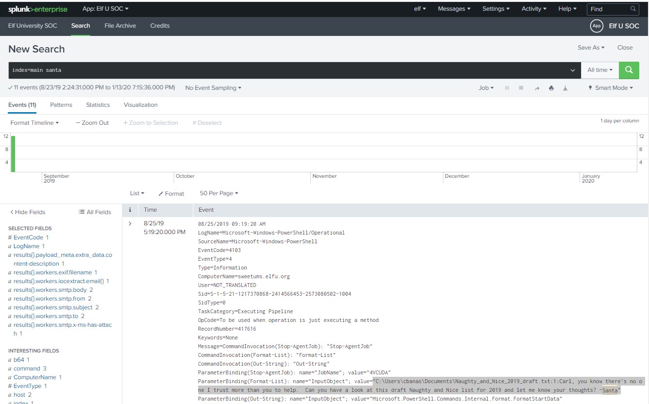 Difficulty: đđđ (3/5) Access https://splunk.elfu.org/ as elf with password elfsocks. What was the message for Kent that the adversary embedded in this attack? The SOC folks at that link will help you along! For hints on achieving this objective, please visit the Laboratory in Hermey Hall and talk with Prof. Banas.