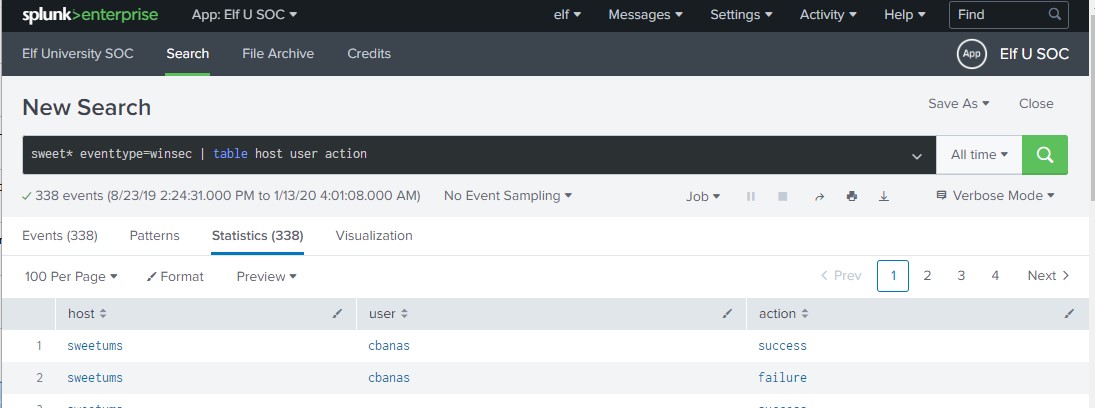 So the answer for the first Training Question, What is the short host name of Professor Banasâ computer?, can be answer by looking in Splunk for the hostname sweetums and see what users are related to it.