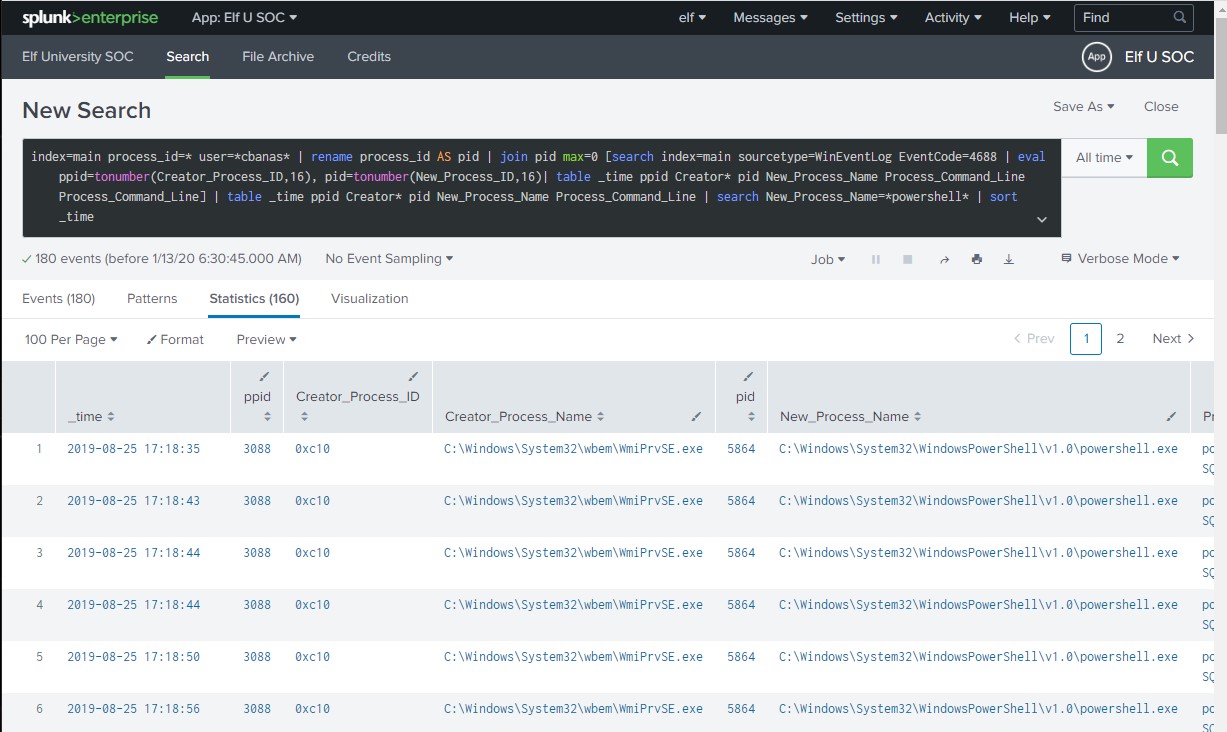 This gives us a list of PowerShell processes created and itâs creator sort ascending by time, so the first time a powershell is executed is listed first, this happened 2019-08-25 at 17:38:35.