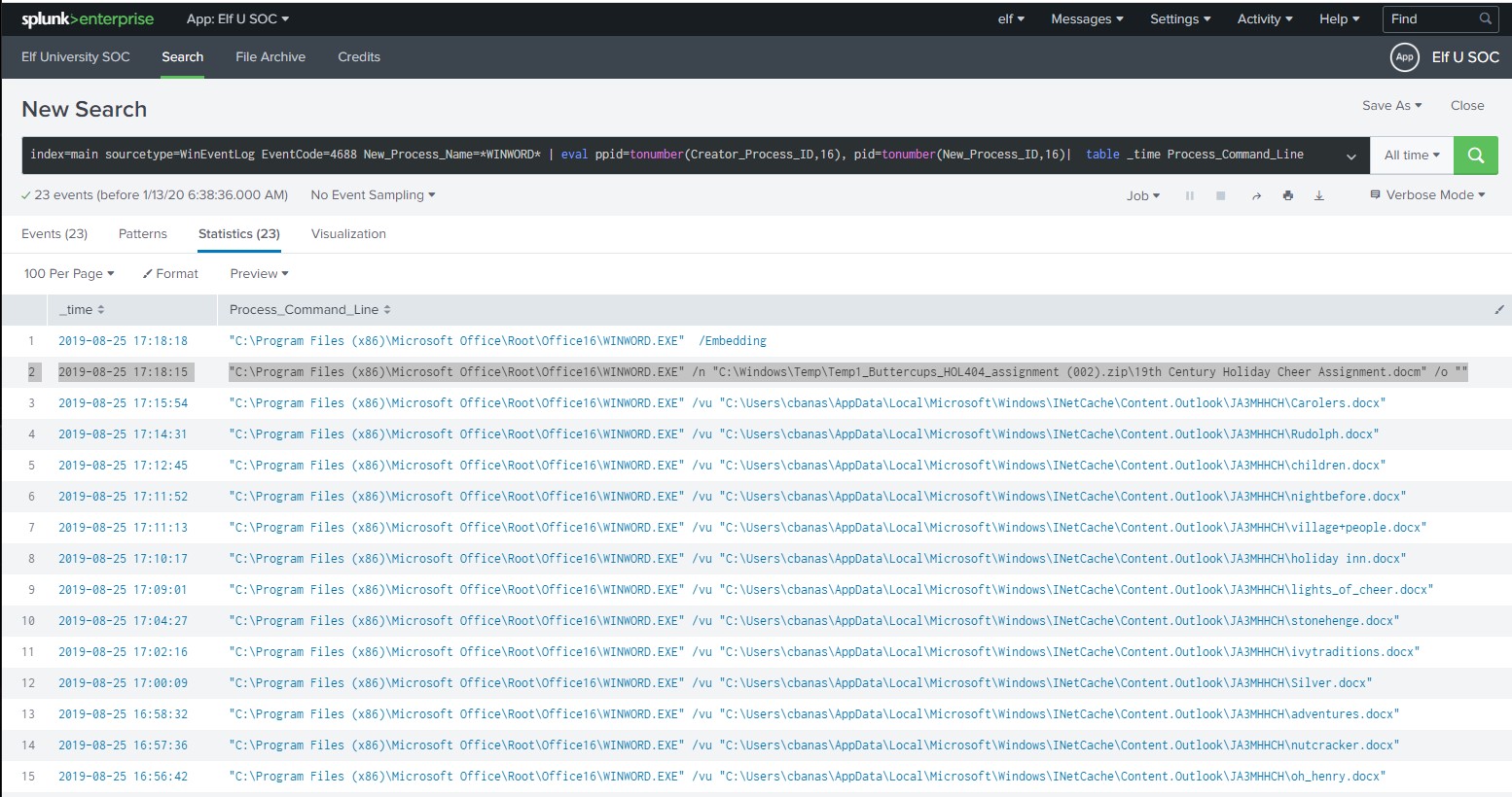 | *index=main sourcetype=WinEventLog EventCode=4688 New_Process_Name=*WINWORD* | eval ppid=tonumber(Creator_Process_ID,16), pid=tonumber(New_Process_ID,16) |  table _time Process_Command_Line* |