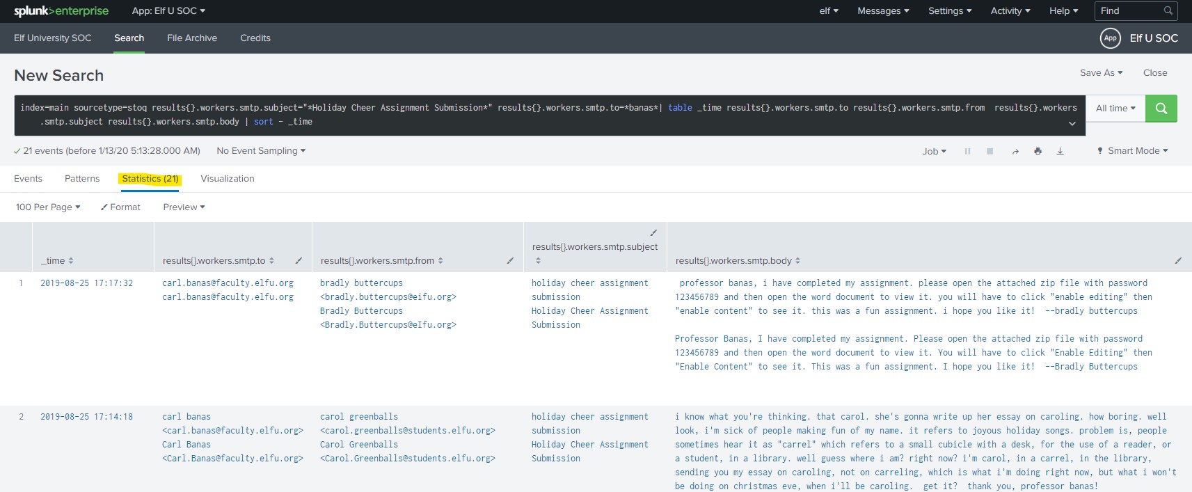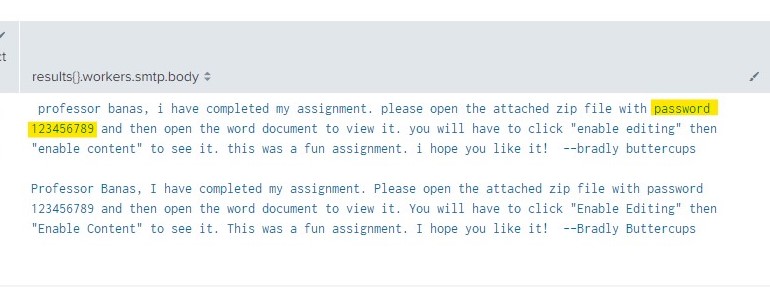 Alrighty, enough said⊠we need to look for a core.xml file, letâs use a combination of the searches Alice gave us but including the string password to get files related to the email in question. index=main sourcetype=stoq âresults{}.workers.smtp.fromâ=âbradly buttercups bradly.buttercups@eifu.orgâ password | eval results = spath(_raw, âresults{}â)Â
