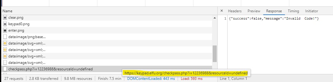 Ā ~$ for code in 1373 1733 3137 3371 7331; do echo $i; curl āhttps://keypad.elfu.org/checkpass.php?i=$code&resourceId=undefinedā; echo -e; done