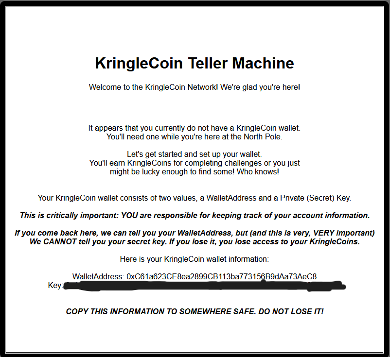 When you get to the North Pole you are given a cryptocurrency wallet while interacting with the teller machine, it seems all the businesses at the North Pole have been persuaded to use KringleCoin, so we’re going to need it as we go and try to collect some coins along the way.